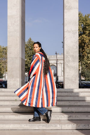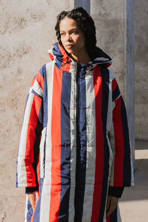 Louisiana Sittingsuit med mørkeblå, røde og hvide striber.